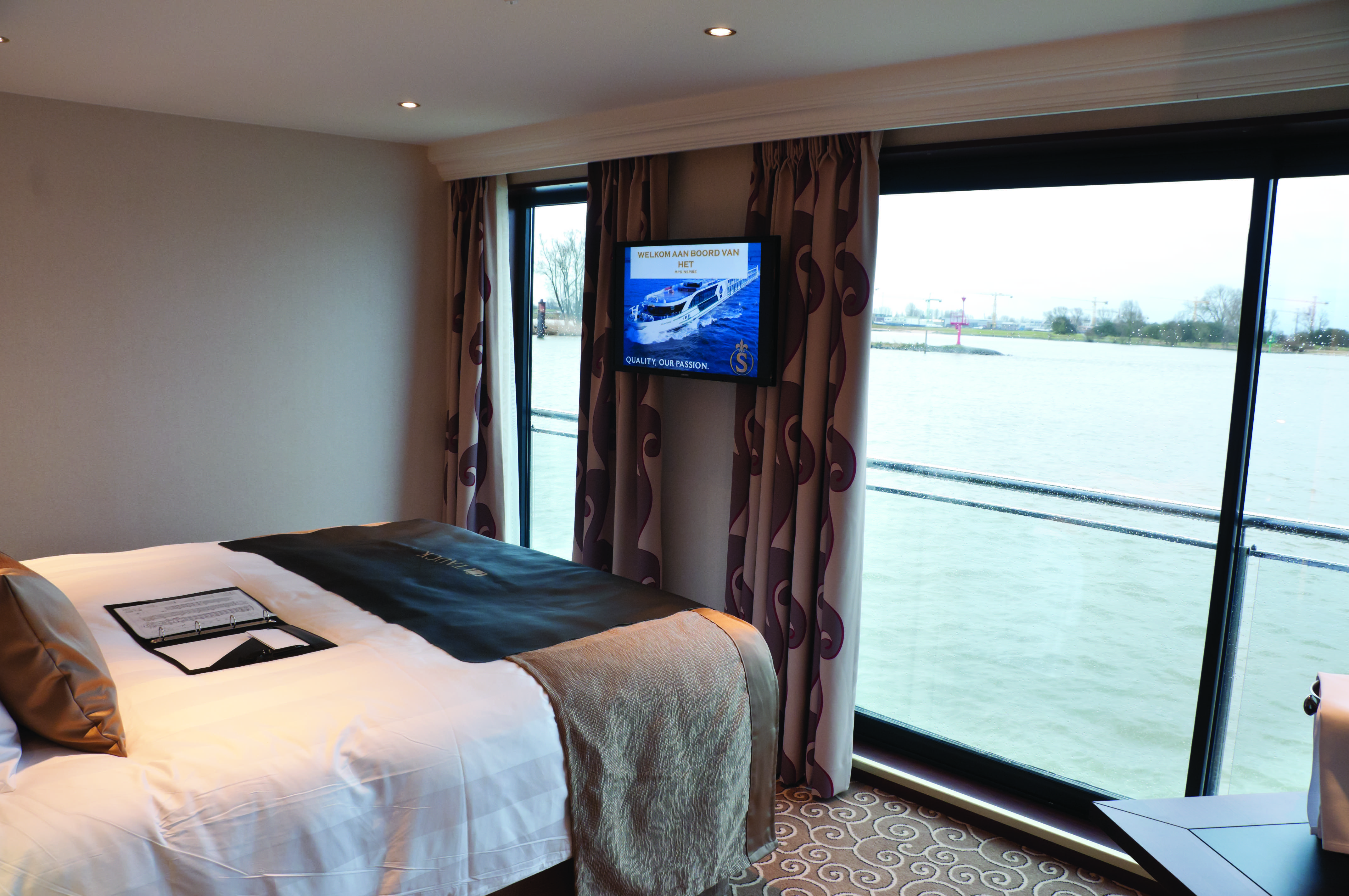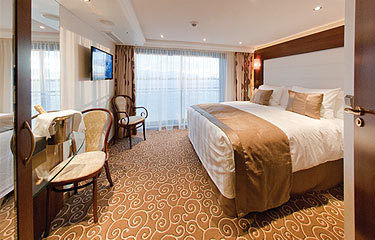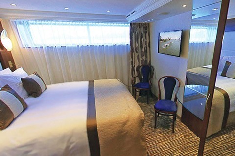 Elegantly designed 225 sq. ft. cabins Bed size: 62 inches X 77 inches (with optional twin-bed configuration) 400 thread count cotton linens\duvets filled with 90% hypoallergenic down\pillows filled with 100% Hungarian goose down, memory foam pillow also available One floor-to-ceiling French Balcony (98 inches wide x 75 inches high) with one sliding door that opens, plus a 98 inch x 37.5 inch fixed window Large bathroom with marble counters, double sinks, larger showers with rainfall shower heads, enhanced lighting, and under-sink storage space Molton Brown toiletries – a Tauck Exclusive Terry-cloth bathrobe plus slippers Coffee maker plus refrigerator stocked with complimentary water and soft drinks replenished daily 32” LED TV 220v and 110v outlets in cabin and bathroom Built-in closets and drawers Easy under-bed luggage  storage Telephone, safe and individual climate control 2 chairs and table Onboard wi-fi available