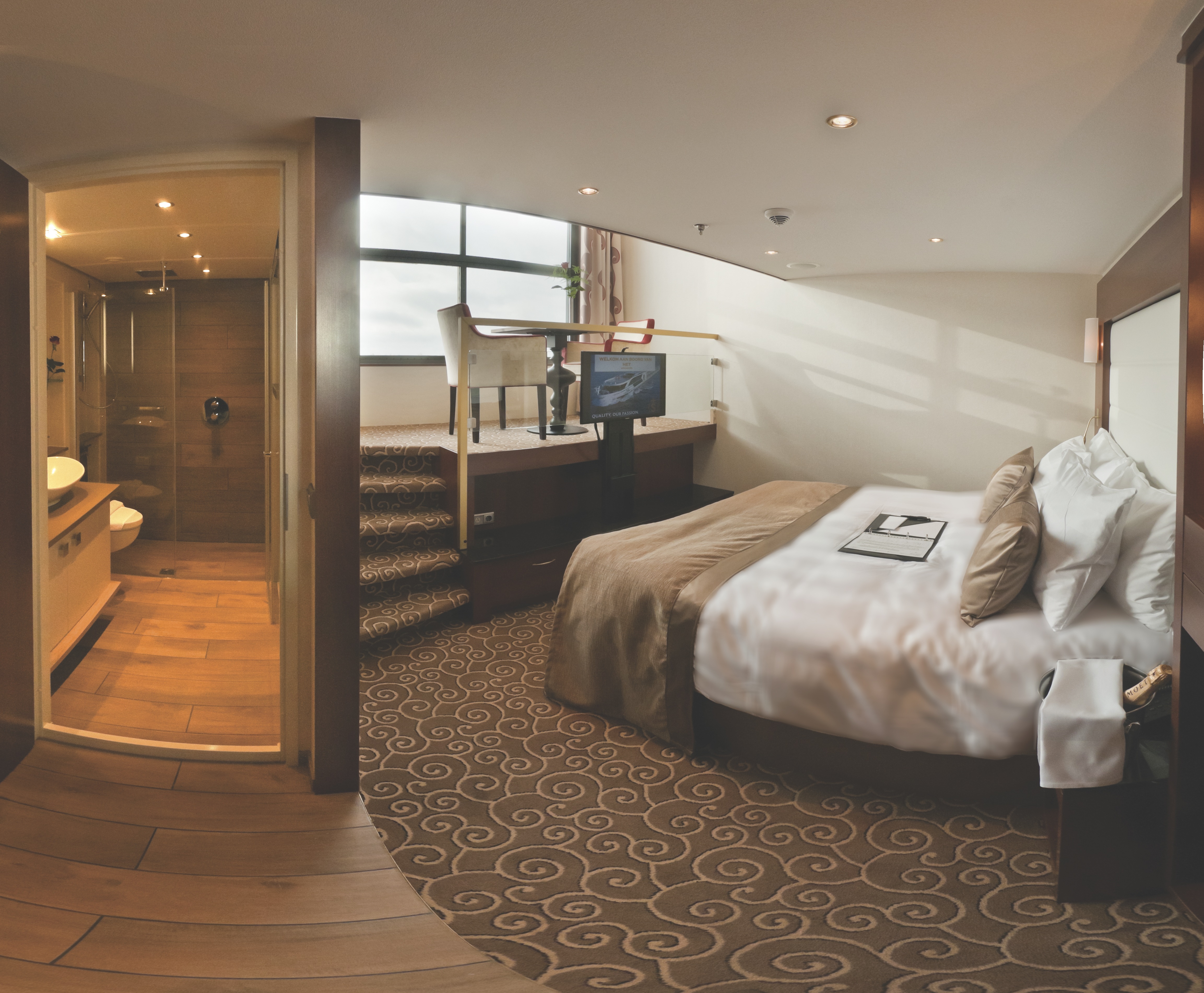 Located on the Emerald deck, Category 3 loft cabins feature a pillow top queen-sized bed, with optional twin-bed configuration with 400 thread count cotton linens/white duvets and pillows of mako cotton with hypoallergenic 90% down filling, as well as a padded headboard with reading lamps. The full-sized bathroom features a large shower with rainfall shower head, enhanced lighting, additional storage and a hair dryer, as well as Molton Brown toiletries and a terry-cloth bathrobe plus slippers. The main living area features a loft sitting area.The room also includes a One-and-a-half deck window that opens at the top, electronically controlled, a mini-bar stocked with complimentary water and soft drinks replenished daily. Amenities also include a 32” LED TV, two chairs plus a desk, a built-in closet with drawers, as well as a telephone, safe, and individual climate control. Wi-Fi is also available onboard.