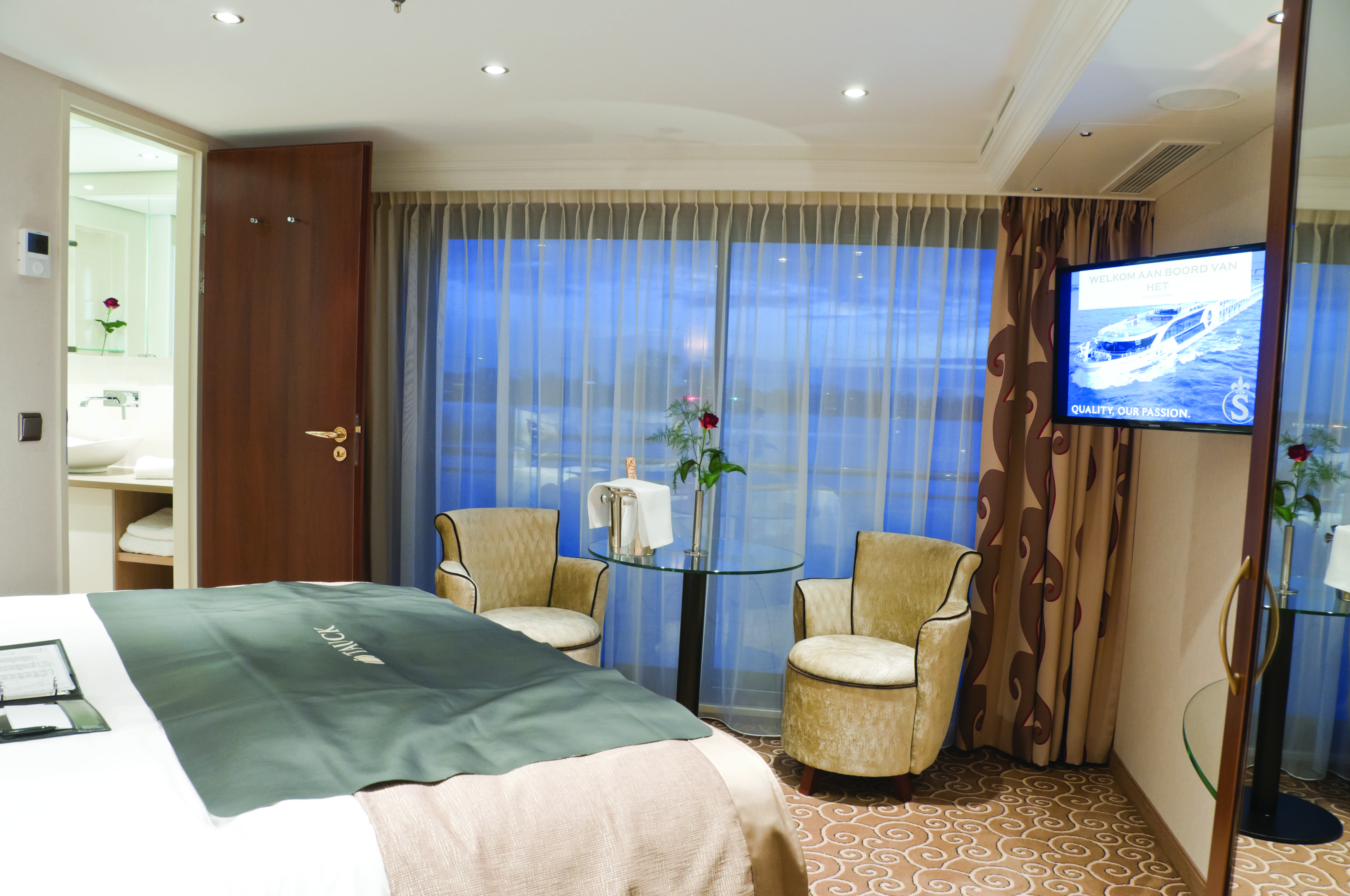 Elegantly designed 300 sq. ft. suites Bed size: 62 inches X 77 inches (with optional twin-bed configuration) 400 thread count cotton linens\duvets filled with 90% hypoallergenic down\pillows filled with 100% Hungarian goose down, memory foam pillow also available Two floor-to-ceiling French Balconies, each 98 inches wide x 75 inches high each with one sliding door that opens Triple & quad cabin made possible by pullout couch (quads for children only) Large bathroom with marble counters, double sinks, large showers with rainfall shower heads, enhanced lighting, and under-sink storage space (note: no bathtub) Molton Brown toiletries – a Tauck Exclusive Terry-cloth bathrobe plus slippers Coffee maker plus mini-bar stocked with complimentary water and soft drinks replenished daily 32” LED TV Breakfast room service Walk-in closet with built-in shelves Iron plus ironing board 220v and 110v outlets in cabin and bathroom Couch, two club chairs & coffee table, plus a desk Easy under-bed luggage  storage Telephone, safe and individual climate control Onboard wi-fi available